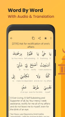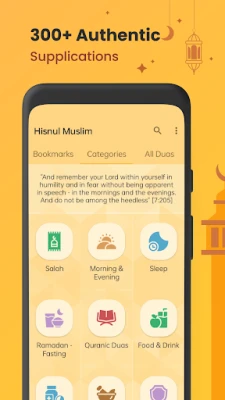 Programu hii inang'aa kwa vipengele vyake vilivyoundwa kwa ajili yako. Unaweza kuweka Dua unazozipenda katika orodha maalum, kurekebisha ukubwa wa herufi kwa urahisi kutumia "pinch-zoom" ili kusoma vizuri zaidi, na kushiriki Dua nzuri hizi na wapendwa wako, iwe ni kwa kutumia picha au hata faili za sauti. Kila Dua inakuja na tafsiri na matamshi sahihi (transliteration), pamoja na faida zake inapowezekana, ili uelewe undani wa ujumbe wake. Hakuna matangazo yatakayokukatisha, na utapokea vikumbusho vya kila siku kukutia moyo. Utafutaji wenye nguvu na mpangilio wa kategoria kama vile Swalah, Asubuhi na Jioni, Usingizi, Ramadhan, Dua za Qur'ani, Chakula na Vinywaji, Ugonjwa na Kifo, Ruqyah, Utakaso, Familia, Rizq, Hajj na Umrah, na Usafiri hurahisisha kupata unachohitaji.