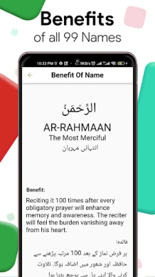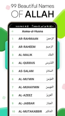 Ndani ya Beautiful 99 ALLAH Names, kila jina la Mwenyezi Mungu linawasilishwa kwa maandishi safi ya Kiarabu, likiambatana na tafsiri fupi kwa Kiingereza na ufafanuzi wa kina kwa lugha ya Kiurdu, hivyo kukuwezesha kuelewa kwa undani zaidi. Sikiliza kisomo cha sauti kwa kila jina, kilichoundwa ili kusaidia kuboresha matamshi yako na kukufanya uzoee sauti sahihi, iwe wewe ni mwanafunzi mpya au unatafuta kukuza ujuzi wako. Njia rahisi ya kubadilisha kati ya majina inafanya mchakato wa kujifunza kuwa rahisi na wenye kufurahisha kwa Waislamu kote ulimwenguni.