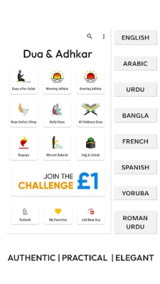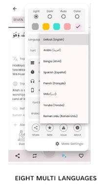 Furahia mpangilio wa kisasa na rafiki kwa mtumiaji, unaokuwezesha kufikia vipengele muhimu kwa urahisi. Kila Dua inakuja na usomaji wa sauti unaovutia, maneno ya Kiarabu yaliyoandikwa kwa herufi za Kilatini (transliteration), tafsiri kamili katika lugha saba kuu, na marejeo thabiti ya Hadith pale inapohitajika. Chagua kutoka fonti sita tofauti za Kiarabu, ikiwemo fonti ya Nurani, au uweke onyesho la Kiarabu pekee. Binafsisha uzoefu wako kwa kuchagua mandhari unayopenda kutoka kati ya ishirini zinazopatikana, na tumia mipangilio ya vitendo kuboresha safari yako ya kiroho.