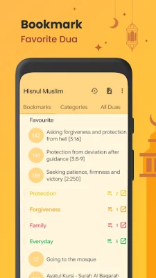 Programu hii inang'aa kwa vipengele vyake vilivyoundwa kwa ajili yako. Unaweza kuweka Dua unazozipenda katika orodha maalum, kurekebisha ukubwa wa herufi kwa urahisi kutumia "pinch-zoom" ili kusoma vizuri zaidi, na kushiriki Dua nzuri hizi na wapendwa wako, iwe ni kwa kutumia picha au hata faili za sauti. Kila Dua inakuja na tafsiri na matamshi sahihi (transliteration), pamoja na faida zake inapowezekana, ili uelewe undani wa ujumbe wake. Hakuna matangazo yatakayokukatisha, na utapokea vikumbusho vya kila siku kukutia moyo. Utafutaji wenye nguvu na mpangilio wa kategoria kama vile Swalah, Asubuhi na Jioni, Usingizi, Ramadhan, Dua za Qur'ani, Chakula na Vinywaji, Ugonjwa na Kifo, Ruqyah, Utakaso, Familia, Rizq, Hajj na Umrah, na Usafiri hurahisisha kupata unachohitaji.